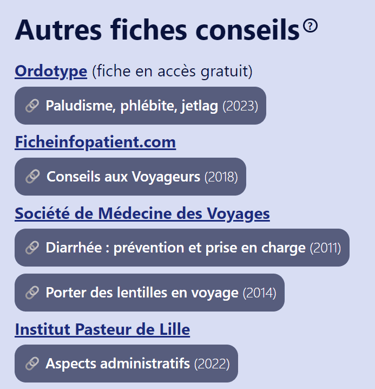 Pour chaque pathologie, un recueil de fiches conseils issues de sociétés savantes, d’associations de patients, de revues médicales, …